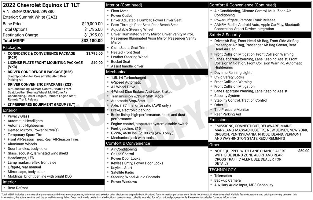 3-Spoke Leather-Wrapped Steering Wheel, 8-Way Power Driver Seat Adjuster, Alloy wheels, AM/FM radio: SiriusXM, Driver Confidence II Package, Driver Convenience Package, Dual Zone Automatic Climate Control, Front & Rear Park Assist, Heated door mirrors, Heated Driver & Front Passenger Seats, Lane Change Alert w/Side Blind Zone Alert, Power windows, Preferred Equipment Group 1LT, Premium audio system: Chevrolet Infotainment 3, Rear Cross Traffic Alert, Rear Power Liftgate, Remote keyless entry, Remote Start, Spoiler, Wireless Apple CarPlay/Wireless Android Auto.Iron Gray Metallic 2022 Chevrolet Equinox LT 4D Sport Utility FWD 6-Speed Automatic Electronic with Overdrive 1.5L DOHC 26/31 City/Highway MPGCredit Concerns? FORGET THEM! Our team of business professionals is ready today to help you get the car you have always wanted and deserved TODAY! The Schumacher family has been serving the community for well over fifty years, and many customers keep returning to us because we treat you like you're family. Come in today and experience the difference! Come and join the family.